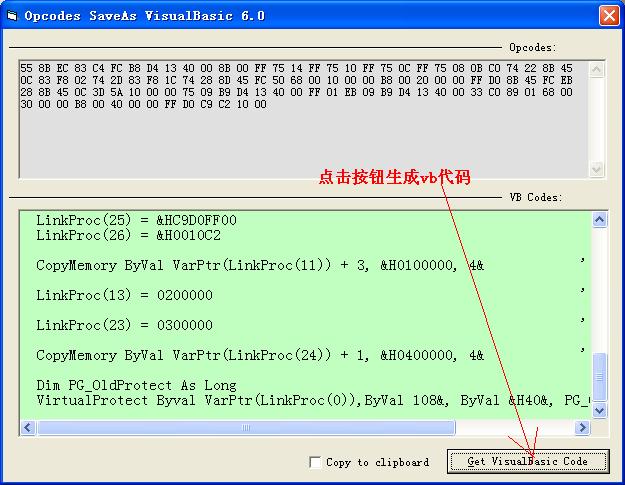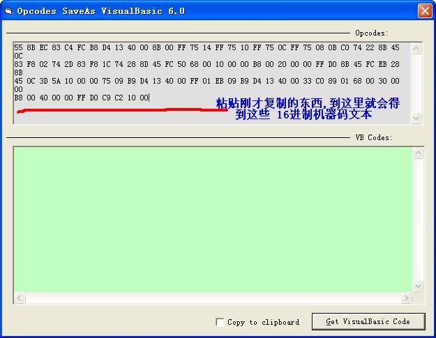 2. 打开 Opcodes SaveAs VisualBasic 6.0,在灰色的文本框中,粘贴,你就会得到一串 55 8B EC 83 C4 FC B8 D4 13 40 00 8B 文本